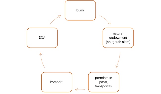 Jika dilihat dari perspektif makro, SDA dapat dimasukkan ke dalam bagian dari Teori Sistem Dunia yang digagas oleh Immanuel Wallerstein sejak 1970an. Gerry van Klinken sudah membahasnya dalam edisi Bacaan Bumi Sistem Dunia dan Sejarah Lingkungan Hidup. Dalam teori tersebut, kita diajak membayangkan adanya pembagian geografis wilayah inti dan pinggiran. Di mana wilayah inti merupakan dunia sejahtera yang kekurangan SDA, sedangkan wilayah pinggiran merupakan dunia miskin namun punya SDA melimpah (Wallerstein 1975; Klinken 2025). Bagaimana bisa sebuah dunia yang punya banyak SDA tapi kok dianggap miskin?