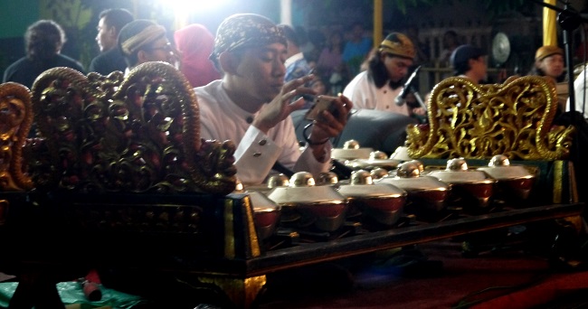 The art of playing gamelan instruments is called karawitan. The term comes from the Javanese word rawit which means intricate or finely worked. According to scholars, the music also matches this description. It is argued that the gamelan orchestra uses a more complex system than western music. The music produced by the gamelan orchestra is built from elaborate components, including both loud and soft instruments. One of the soft instruments, which adds melodic layers, is the singers’ voices. Karawitan divide the singing parts into the male singing, called gerongan, and the female singing, called sindenan.