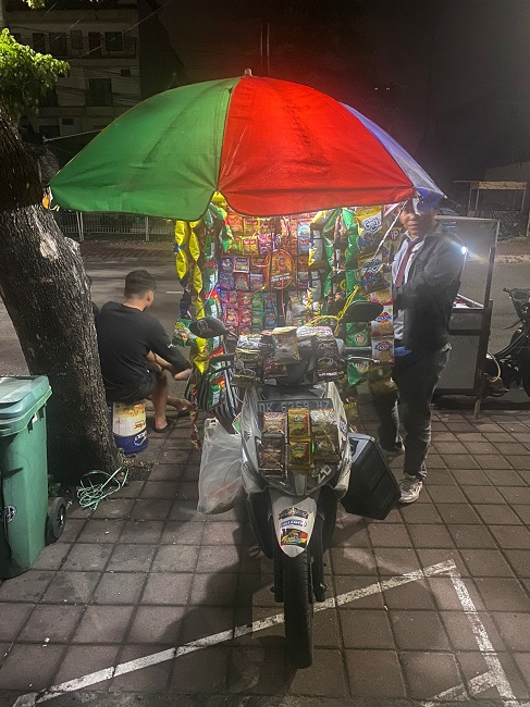 Pak Joni is remarkable and unique. Selling to locals around the beach road or Dewi Sri in the Kuta area he cuts a striking figure that seems out of place. He is easily recognisable by his very neat and formal attire, replete with tie, collared shirt and closed toe footwear. ‘My uniform when I was a tour bus driver, it's neat like this, shirt, tie and shoes, so I still feel like I am working like before, keeping up appearances,’ he explained. Pak Joni is an example of many in Bali who proactively chose to change career directions and to begin to forget about tourism.