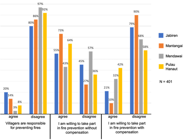 Limbungnya skema pencegahan ini melanggengkan ketidakadilan terhadap masyarakat Dayak yang banyak di antaranya berkiprah dalam kelompok pemadam kebakaran lokal. Desentralisasi pengelolaan kebakaran hutan dan lahan menempatkan komunitas ini sebagai garda terdepan mitigasi karhutla yang dihadapkan langsung pada api, asap beracun, dan cuaca yang mendidih. Atas partisipasi mereka, lembaga pemerintah dan korporasi yang membutuhkan bantuan untuk memadamkan kebakaran di dalam konsesi, membayar para ‘sukarelawan’ sebesar Rp 100,000-150,000 (AU$10-15) per hari. Berdasarkan survei kami (Grafik 1), meskipun harus menanggung berbagai risiko kesehatan, sebagian besar masyarakat Dayak bersedia terlibat dalam mencegah dan memadamkan kebakaran. Langkanya kesempatan kerja formal dan merosotnya pilihan mata pencaharian memaksa masyarakat untuk menyambar kesempatan apa pun yang ditawarkan kepada mereka. Akan tetapi, dinilai dengan acuan apa pun, manfaat ekonomi dari kegiatan pemadaman sungguh tidak ada apa-apanya dibandingkan dengan kerusakan yang ditimbulkan oleh kebakaran terhadap hutan, lahan, dan budaya mereka.