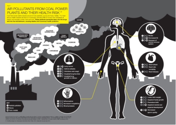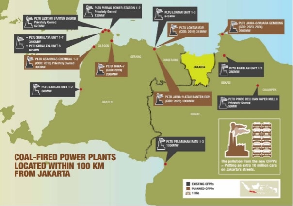 Electricity production from the many coal-fired power plants in Java generate carbon dioxide air pollution, as well as nitrogen dioxide, sulphur dioxide, and fine dust containing heavy metals such mercury, lead, arsenic, and cadmium that go deep into people’s lungs. According to a Greenpeace report, Jakarta is surrounded by ‘silent killers‘ that help produce some of the worst air pollution in the world (Figure 1). Another Greenpeace report highlights the long-term health impact of disease and organ damage caused by coal pollution (Figure 2). Much of this coal comes from mines in Kalimantan. Transporting it in barges also pollutes the ocean and the coral reefs of beautiful places like Karimun Islands.