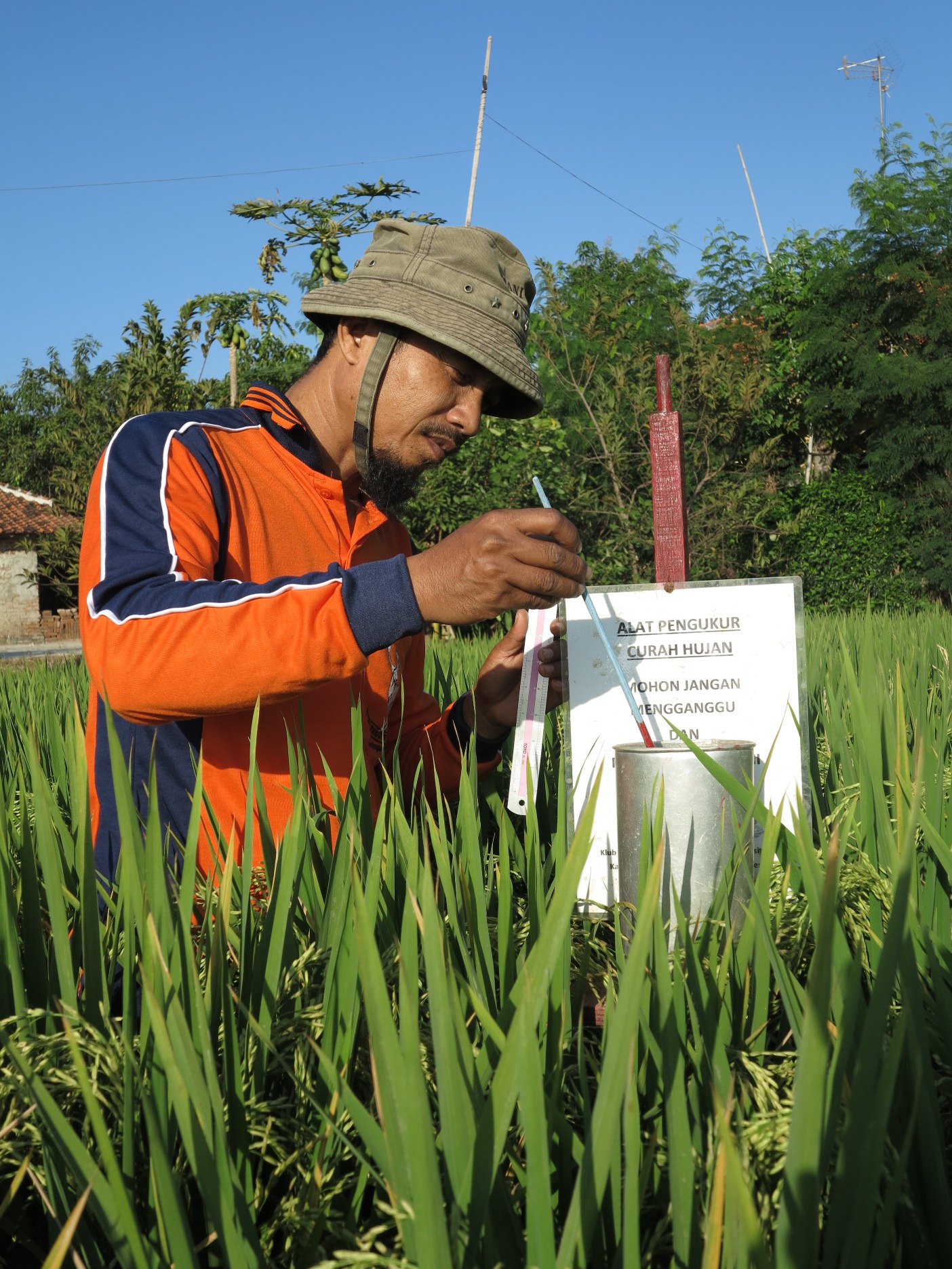 Dadi and the others are all farmers who participate in so-called ‘Science Field Shops’ – a new approach to agricultural extension. Traditionally, agricultural extension agents have passed on the government’s information in top-down communications to farmers. This new approach uses an adult learning method prepared by and for farmers and by experts in agrometeorology and environmental anthropology. Farmers have monthly meetings in farmers’ houses where they spend time in discussion, as they would in a small neighbourhood shop, or warung. At the meetings, the farmers report their rainfall and agroecosystem data from the past month, and discuss the issues they face, such as pest and disease outbreaks, flood, drought, and water management problems. Through these discussions in so-called Science Field Shops (SFS), they share experiences to solve their challenges.