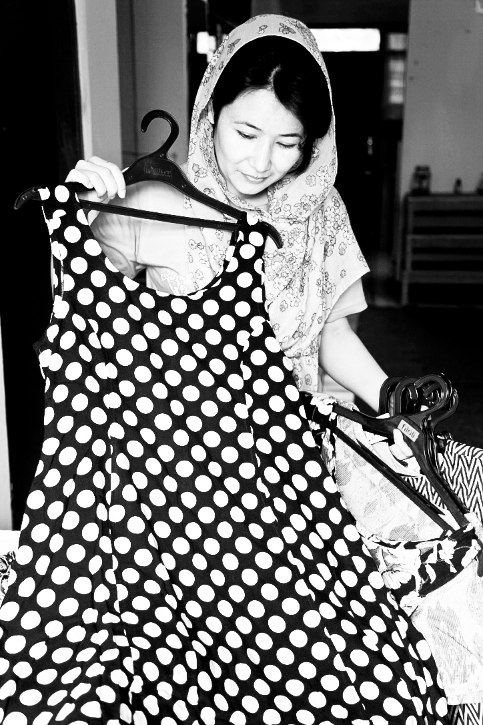 Kalsoom Jaffari showing some of the beautiful dresses made by the women from her Refugee Women Support Group (Angela Richardson) |