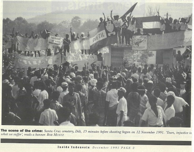 Bob served as South East Asia Projects Officer at Community Aid Abroad (CAA, later renamed Oxfam Australia). It was this role that led him to be in Dili, Timor Leste on 12 November 1991, where he was witness to the Santa Cruz massacre, at which at least 100 people were massacred by the Indonesian military. The victims included Bob’s companion during his time in Dili, Kamal Bamadhaj, a member of Inside Indonesia’s Sydney committee.