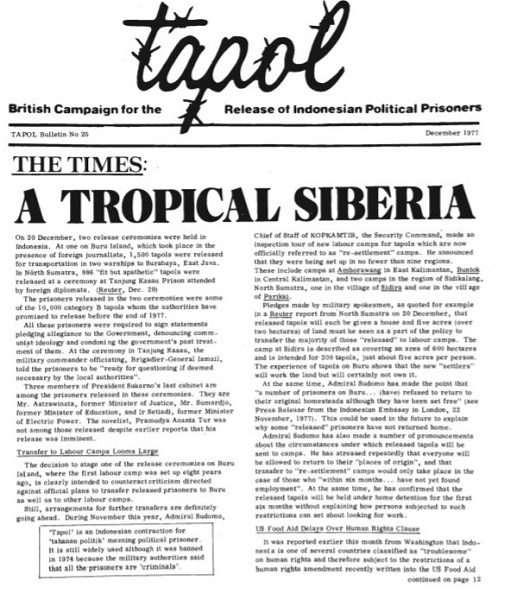In 1978, as a result of pressure from advocacy groups including TAPOL, the International Labour Organisation (ILO), the International Commission of Jurists (ICJ), Amnesty, together with a new emphasis on human rights from the USA’s Carter Administration, the Indonesian government released the majority of political prisoners from 1965. The culmination of domestic pressure in donor countries had moved Western governments to press the issue. Here, the role of TAPOL along with other organisations, academics and journalists, was crucial in shaping domestic opinion by continuously reminding the public of the plight of those in prison.