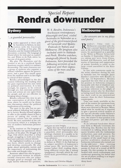 The early years of publication include several articles highlighting the work of the poet, playwright and director, Rendra. ‘Rendra Downunder’, an account of Rendra’s tour of Australia in 1988, includes a discussion by Rendra of the ‘mission’ of his theatre group in Yogyakarta, Teater Bengkel. Artists need to take sides, he said, to work for social change. ‘Any change is meaningless unless its objective is freedom and equality for all’.