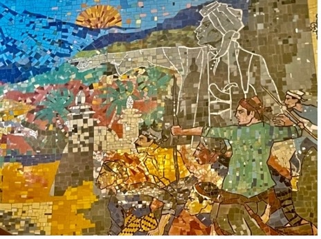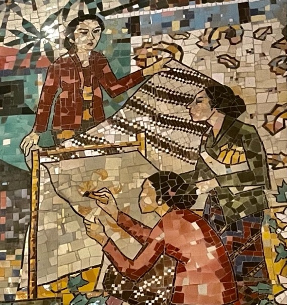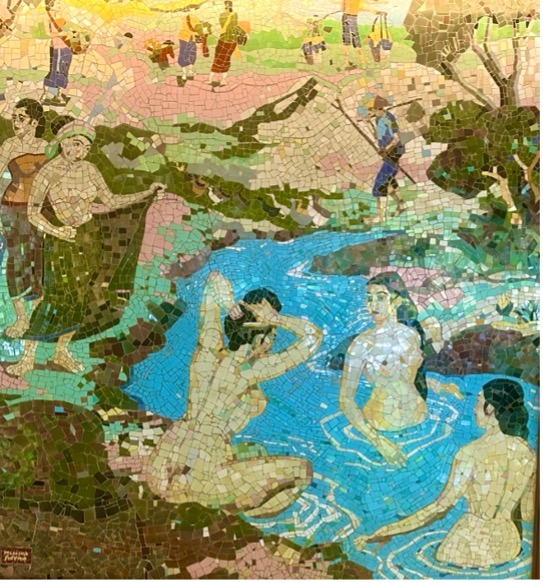 The mosaic is a romanticised portrait of rural Java. Aside from a small image of the 9th century Buddhist monument Borobudur, there are no identifiable places. The images are of healthy and happy young people, most of them women, engaged in the daily activities of village life, farming, preparing food, bullock carts and a village market. A scene of young women bathing in a river may reflect Sukarno’s interest in erotic imagery. The overall simplicity and lack of symbols of conflict and modernity evokes his Marhenist ideology that locates the essence of Indonesia in self-sufficient village communities. It also resonates with the nostalgia many Javanese have for the (alleged) simplicity and tranquility of village life.