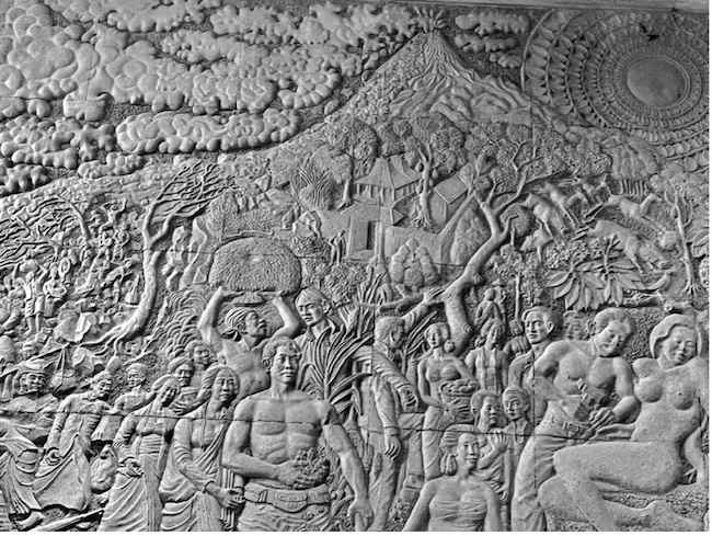 Untung Rugi di Lereng Merapi is stylistically very different from the two mosaics. It is a relief carving similar to those found on the ancient Buddhist and Hindu monuments Borobudur and Prambanan. It also includes elements of socialist realism, the Soviet art style that combined realist technique and idealist representations of life under socialism, or in Sukarno’s case Marhenism. Merapi is the volcano located to the north of Yogyakarta. Villagers living on its slopes are threatened by periodic eruptions the most recent of which was in 2010. Until the 1980s with the proliferation of cars and motorcycles and the resulting air pollution it was clearly visible nearly every day from any place in the city. It also figures prominently in the sacred geography of the Yogyakarta Sultanate. Sunan Merapi is the guardian of the mountain and is believed to prevent lava and pyroclastic flows from reaching the city. It is also the northern terminus of a mystical axis that extends through the kraton and ends at a shrine dedicated to Gusti Kangjeng Ratu Kidul, the Queen of the spirits of the Southern Ocean and spirit wife of the Sultans of Yogyakarta at Parangkusumo on the southern coast.