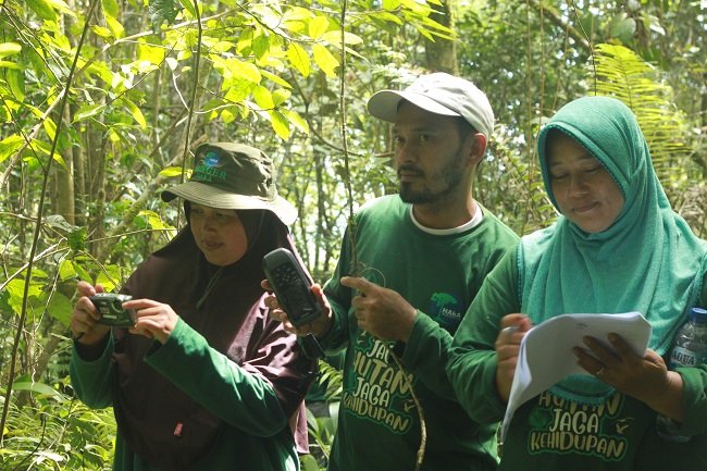 Permit in hand, LPHD together with the community then drafted a management plan for the village forest. This included forming the Damaran Baru LPHD ranger team in January 2020. Led by Sumini, the ranger team is Aceh’s first-ever women-led ranger team. Their main task is to patrol the Damaran Baru village forest to discourage logging and land encroachment. Its personnel are comprised of LPHD members, many of them women, together with their close male relatives: husbands and sons. The organisational structure is divided into three areas. The first has three rotating teams, each of eight individuals, both men and women. Each team goes out on daily patrol for five days a month. Next is an overnight team, composed of five men, who go out on longer, overnight patrols farther into the forest. Third is a restoration team, composed of all women. It engages in restoration activities – planting seeds and preparing seedlings to be taken to the restoration area.
